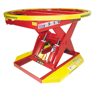 Se ajusta automáticamente cuando se añaden o retiran cajas Su mecanismo con resortes único no requiere alimentación eléctrica Trabaja con cargas de 181 a 2,041 kg La plataforma de la tornamesa gira las cargas para facilitar el acceso Hueco para horquillas para una fácil reubicación El nivelador de cargas en tarimas original con mejoras continuas