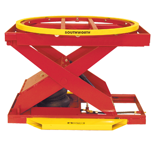 La bolsa de aire de uso rudo ajusta automáticamente la altura de la carga cuando se añaden o retiran cajas Cuando se llene la bolsa de aire con un compresor portátil o con aire del taller, la unidad puede ubicarse en cualquier sitio Trabaja con cargas de 181 a 2,041 kg El anillo de la tornamesa gira las cargas para facilitar el acceso Huecos para horquillas para facilitar la reubicación