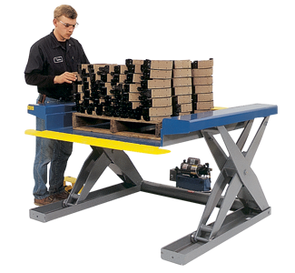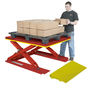 Plataforma estilo bandeja que desciende hasta la altura del piso Puede cargarse y descargarse con un transpaleta Elija entre una capacidad de 1,134 o 1,814 kg Los paneles laterales delgados permiten que los trabajadores se paren cerca de la carga; minimizando la necesidad de estirarse El sensor óptico detiene el descenso cuando se interrumpe el haz