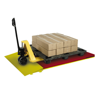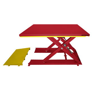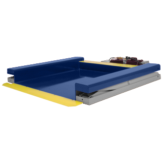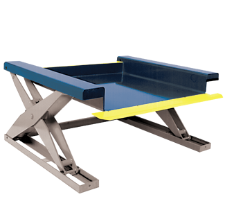 Plataforma estilo bandeja que desciende hasta la altura del piso Puede cargarse y descargarse con un transpaleta Bordes de seguridad de elastómero de color amarillo que protegen a los trabajadores Acceso a las tarimas por los cuatro lados Disponible con capacidades de 907, 1,814 y 2,721 kg