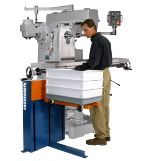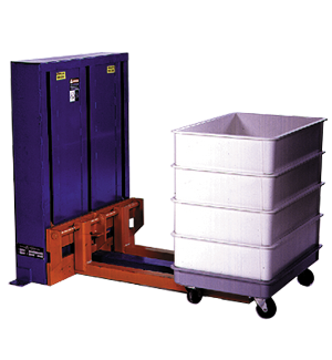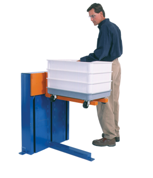 Elevador con mástil vertical con capacidad de 453 kg Altura final de 722 mm Ideal para contenedores plásticos o contenedores pequeños Disponible con horquillas o plataforma