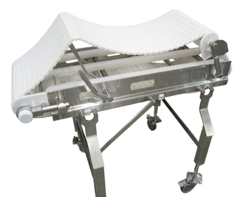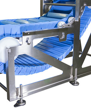 El armazón está diseñado sin superficies horizontales para una limpieza óptima. Transportadores de más de 10 ft de longitud que consisten en secciones múltiples que se atornillan juntas (pueden soldarse en el sitio).